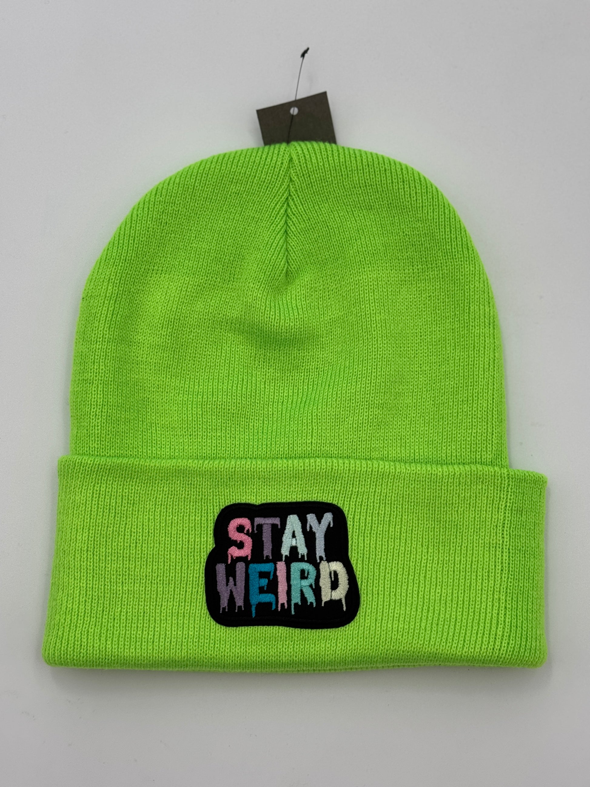 Rock your individuality with this neon green beanie that screams personality. The standout "Stay Weird" patch features a vibrant multicolored drip font against a bold black background—a perfect statement for anyone who embraces their unique vibe. One size fits all means everyone can join the weird club. Cozy, comfortable, and unapologetically bold, this beanie is your wearable reminder to celebrate what makes you different.