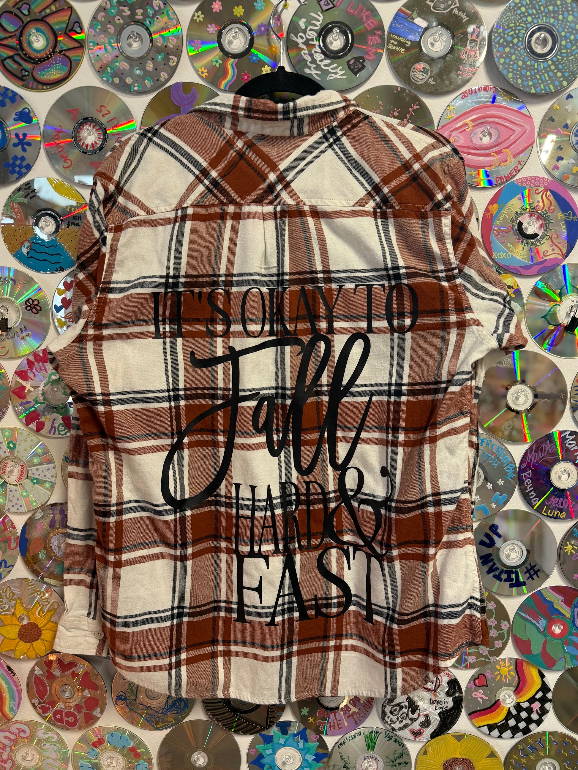 Embrace the season with this cozy plaid flannel featuring traditional fall hues that'll have you looking forward to crisp mornings and sweater weather. The back displays an encouraging message in warm brown lettering: "It's okay to fall hard and fast." Perfect for layering or wearing solo, this XL flannel combines comfort with a dash of humor—because sometimes the best things in life deserve a little enthusiasm.