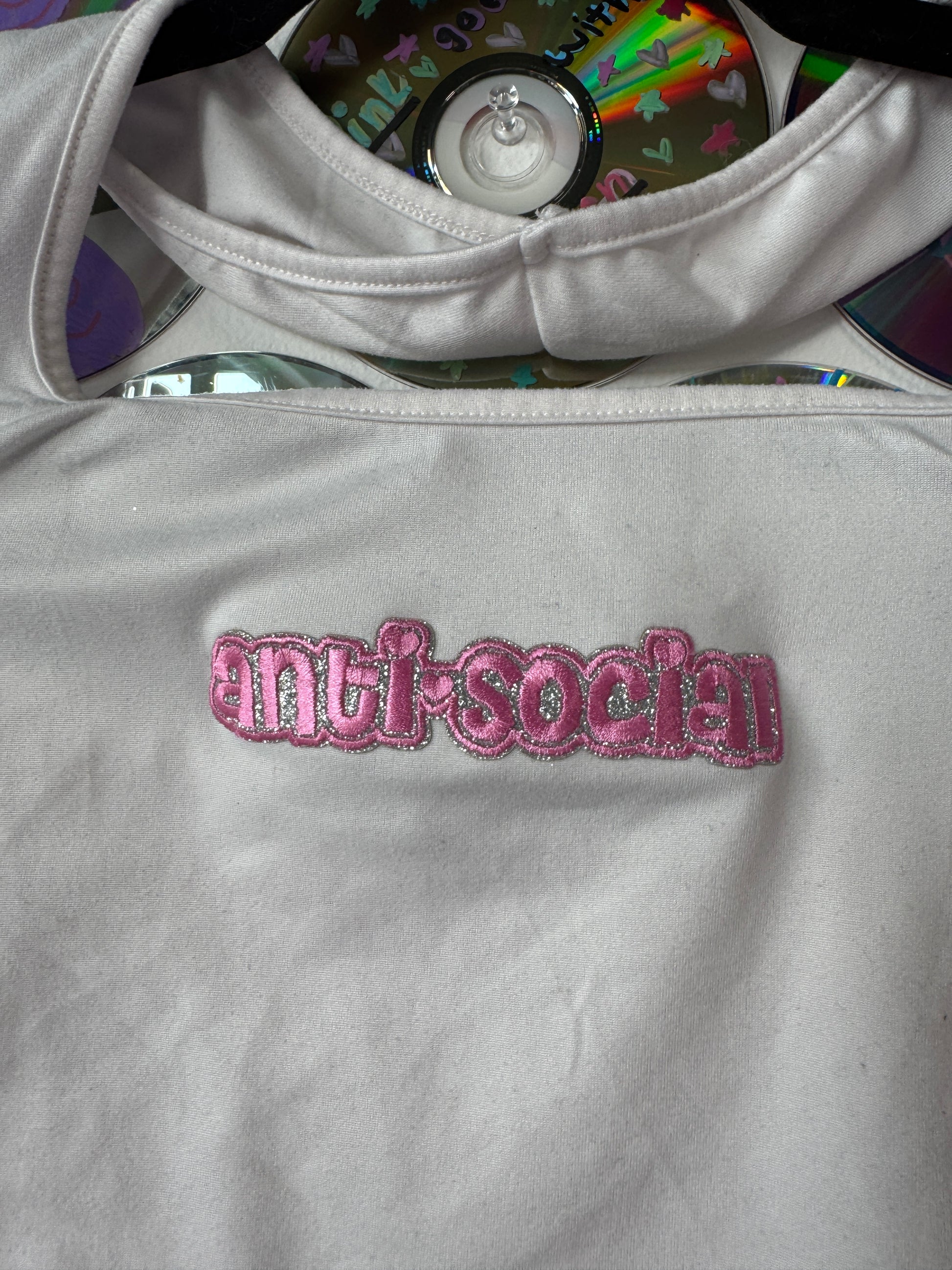 White Halter top size XS that features a patch on the chest that reads "anti-social" in glitter lettering with a silver accents.