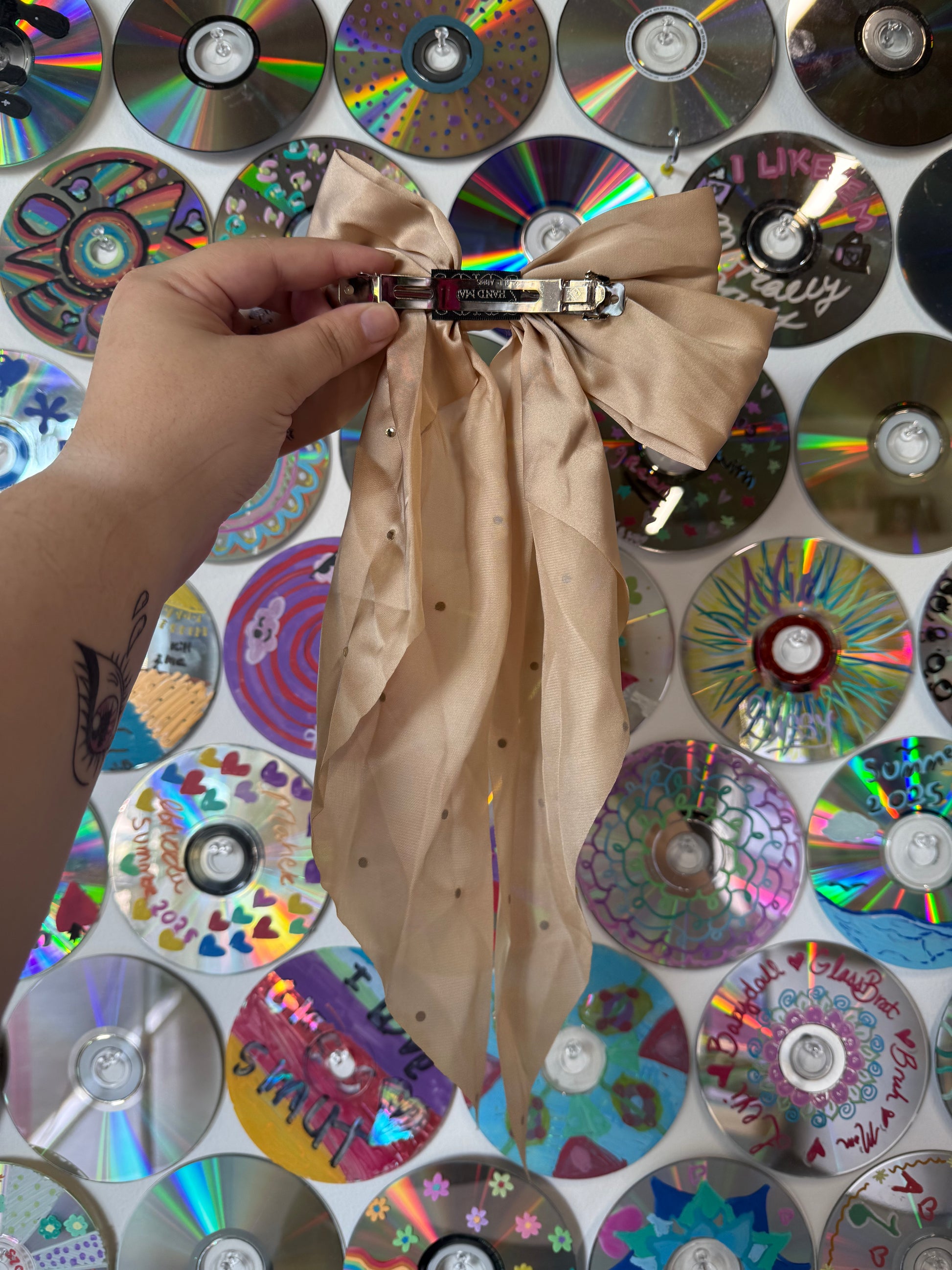 Champagne colored Satin bow with Large barrette clip. With a custom sprinkling of rhinestones for a touch of extra sparkle.