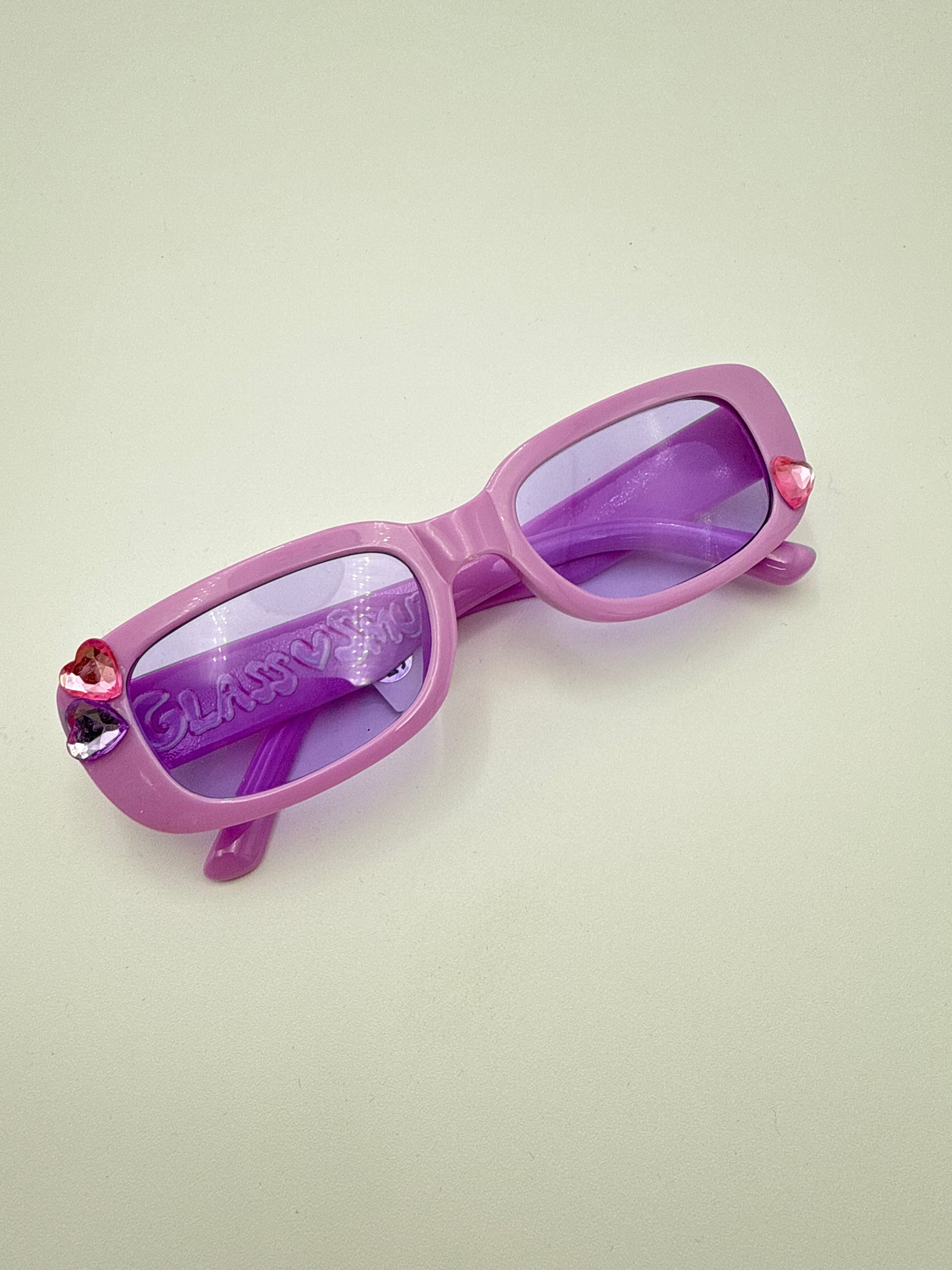 Lilac sunglasses frame with purple tinted lenses in a rectangular style common in the 90's with heart gems added around the frames.