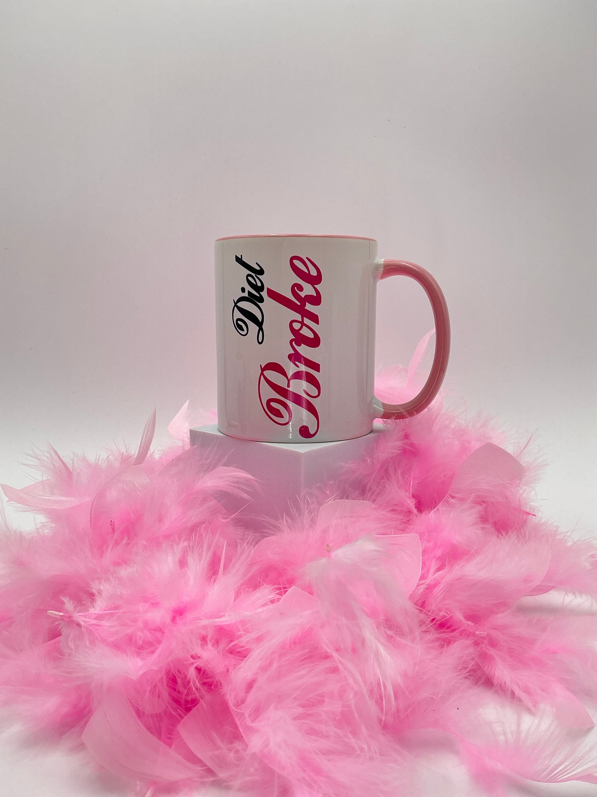 12oz ceramic mug with a pink handle that features GlassSmut Original Design Diet Broke in black and pink on both sides.