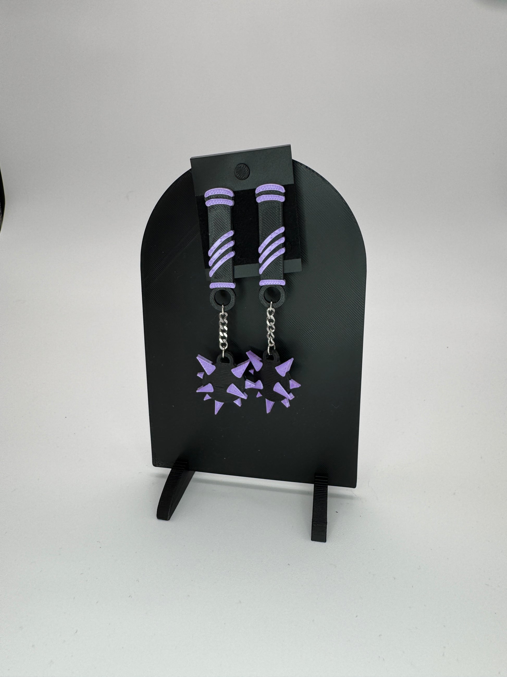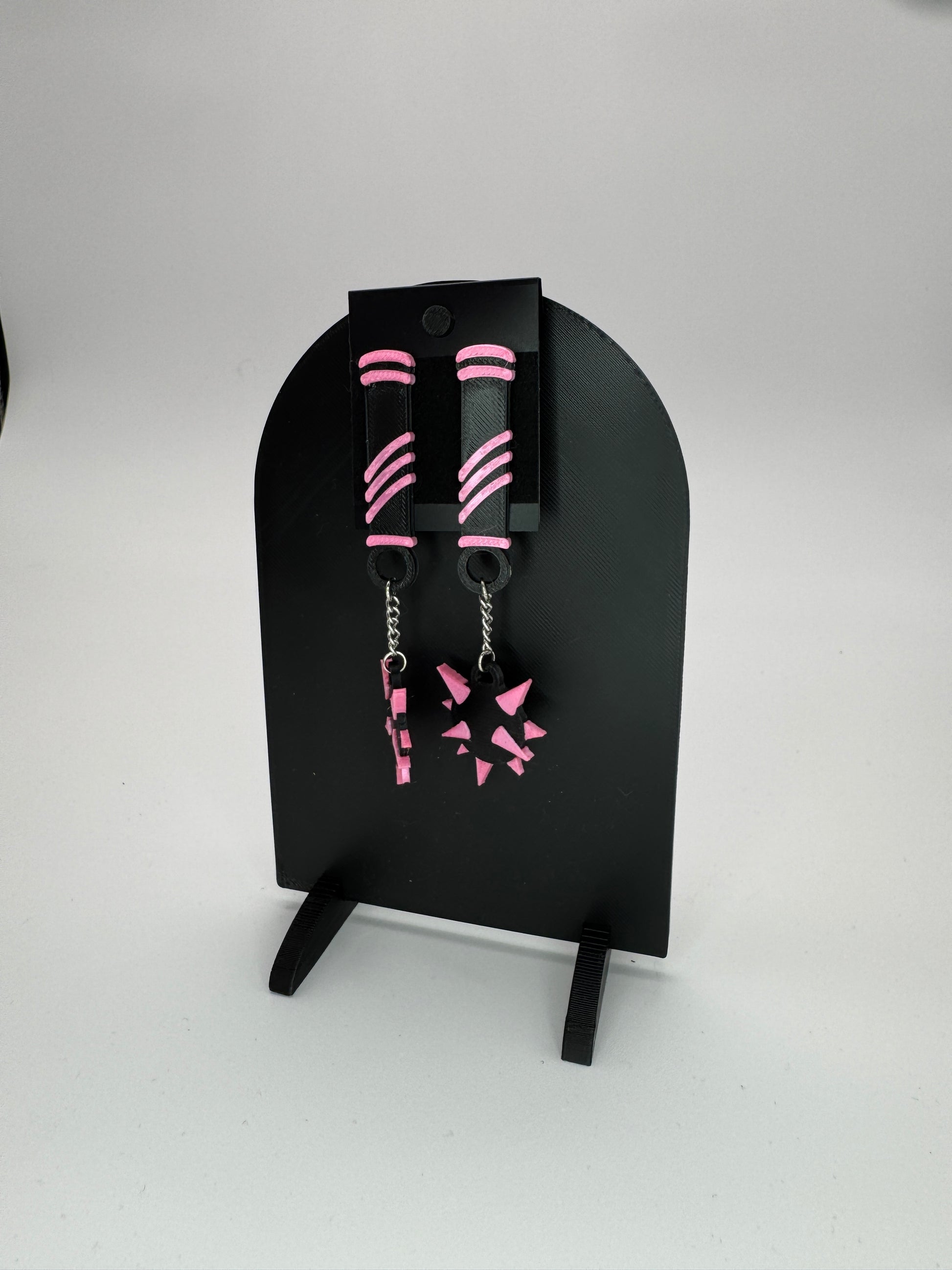 Dangle stud earrings the handle of a Flail with a studded ball and chain hanging loosely. 3D Printed and ultralightweight means you get all the spice with out the sore ear lobe.