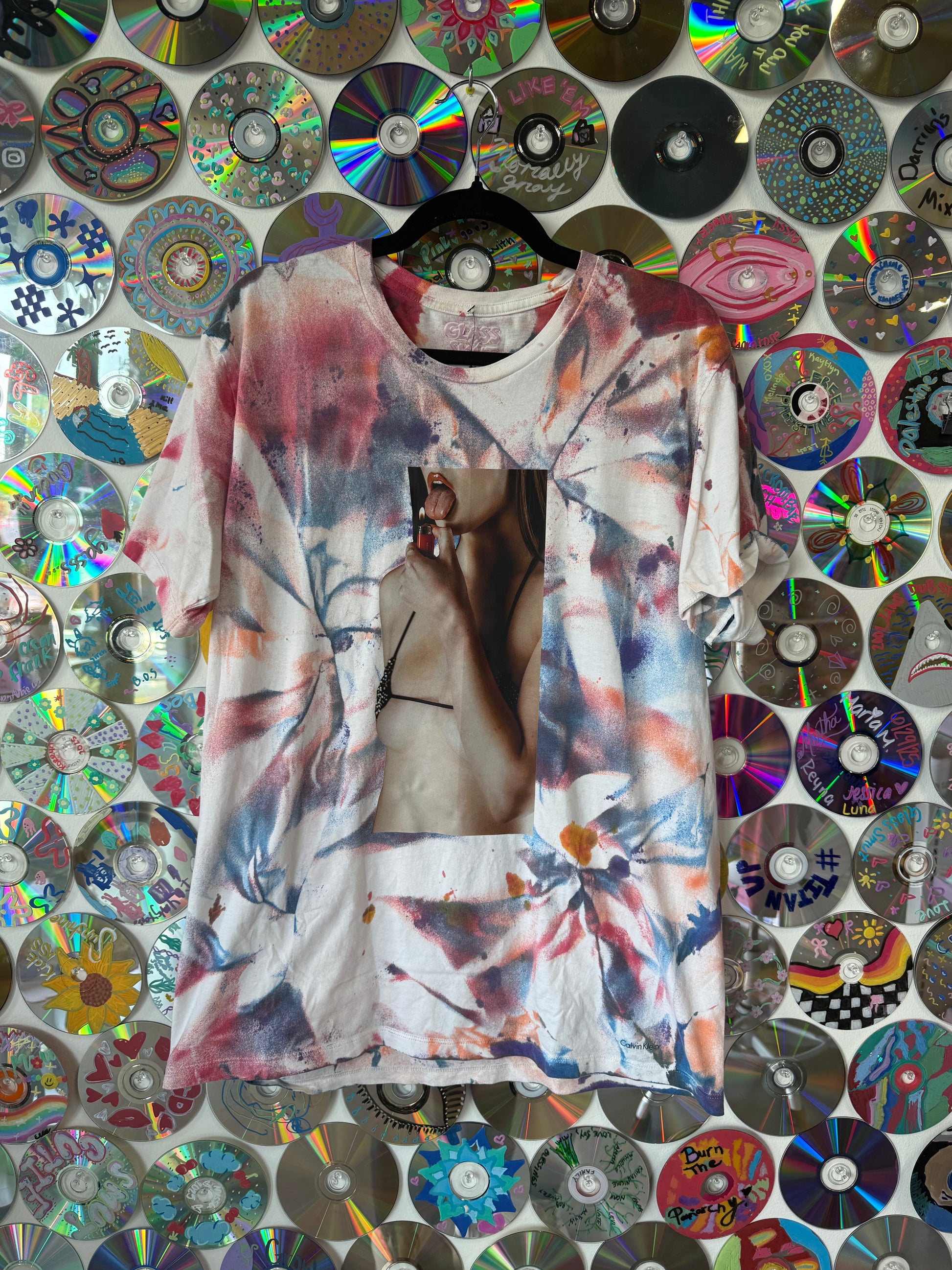 Size Large Red Blue Purple and Orange on White tye-dye shirt with GlassSmut Original Design Flicker On the chest. A backgroundless piece featuring a woman in a gemstone bikini licking a light flame