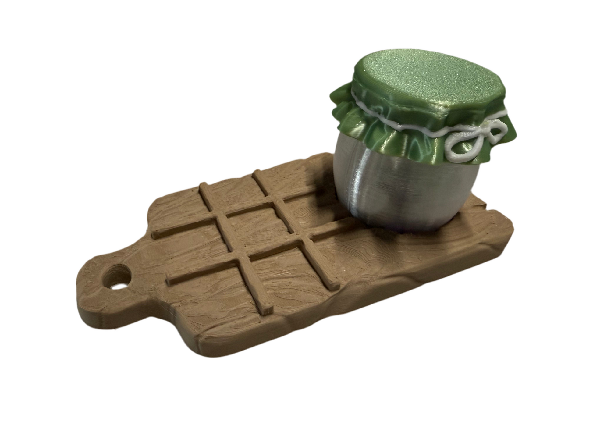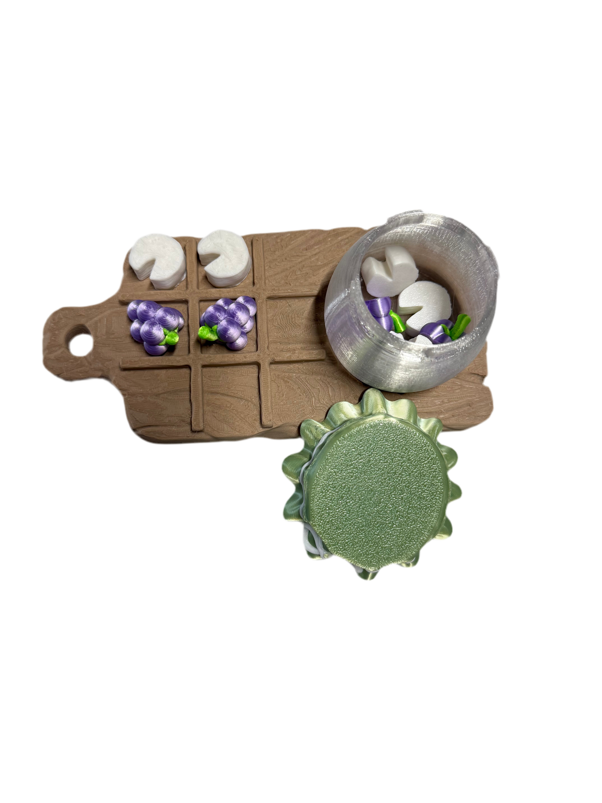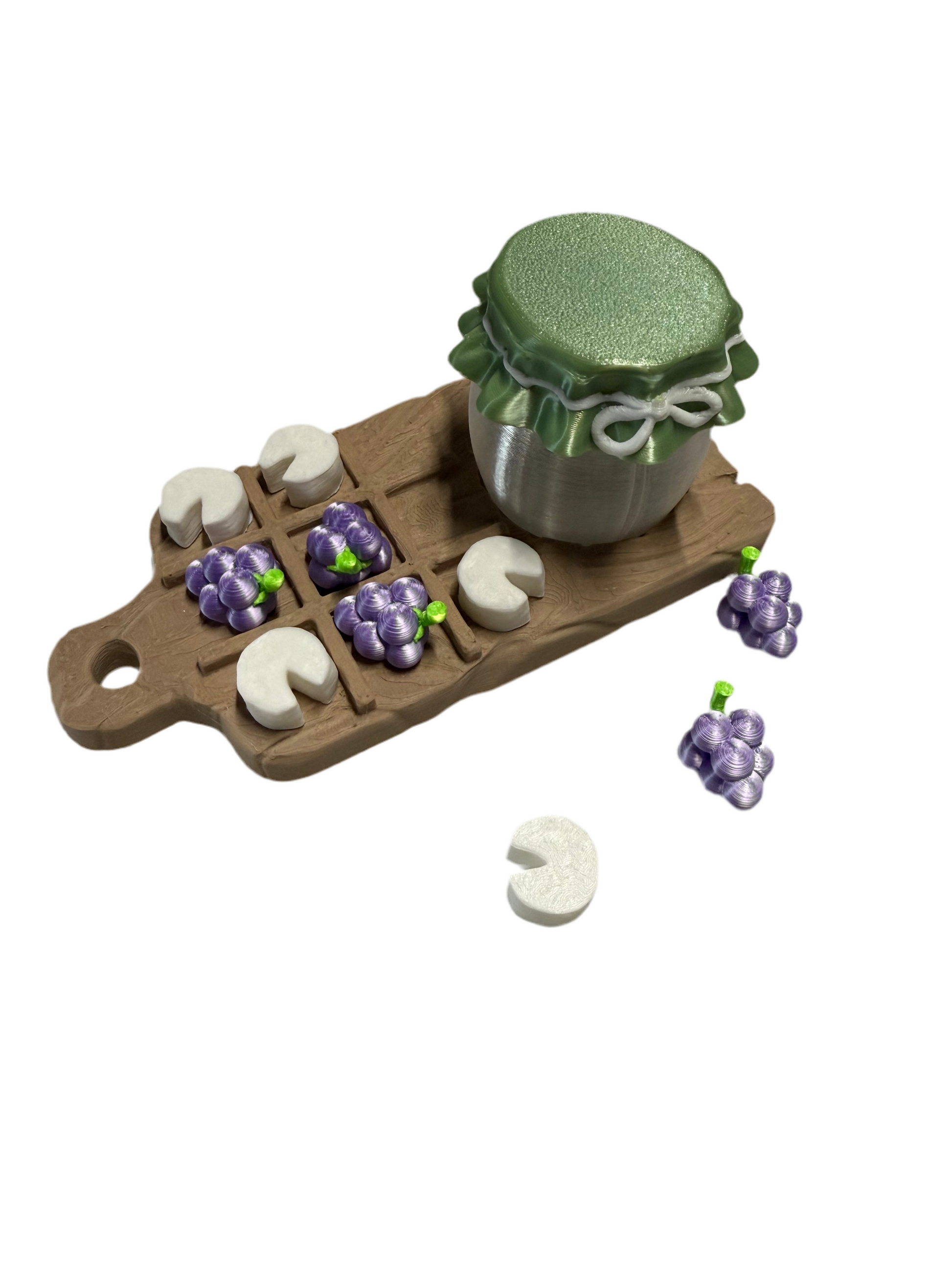 3D printed Tic-Tac-Toe Set. Charcuterie Board play board. Silver jar with pink frilly lid to contain your Grape and Brie Cheese playing pieces. The perfect whimsical piece to keep on your coffee table or give as a gift to the friend that only eats Girl Dinner.