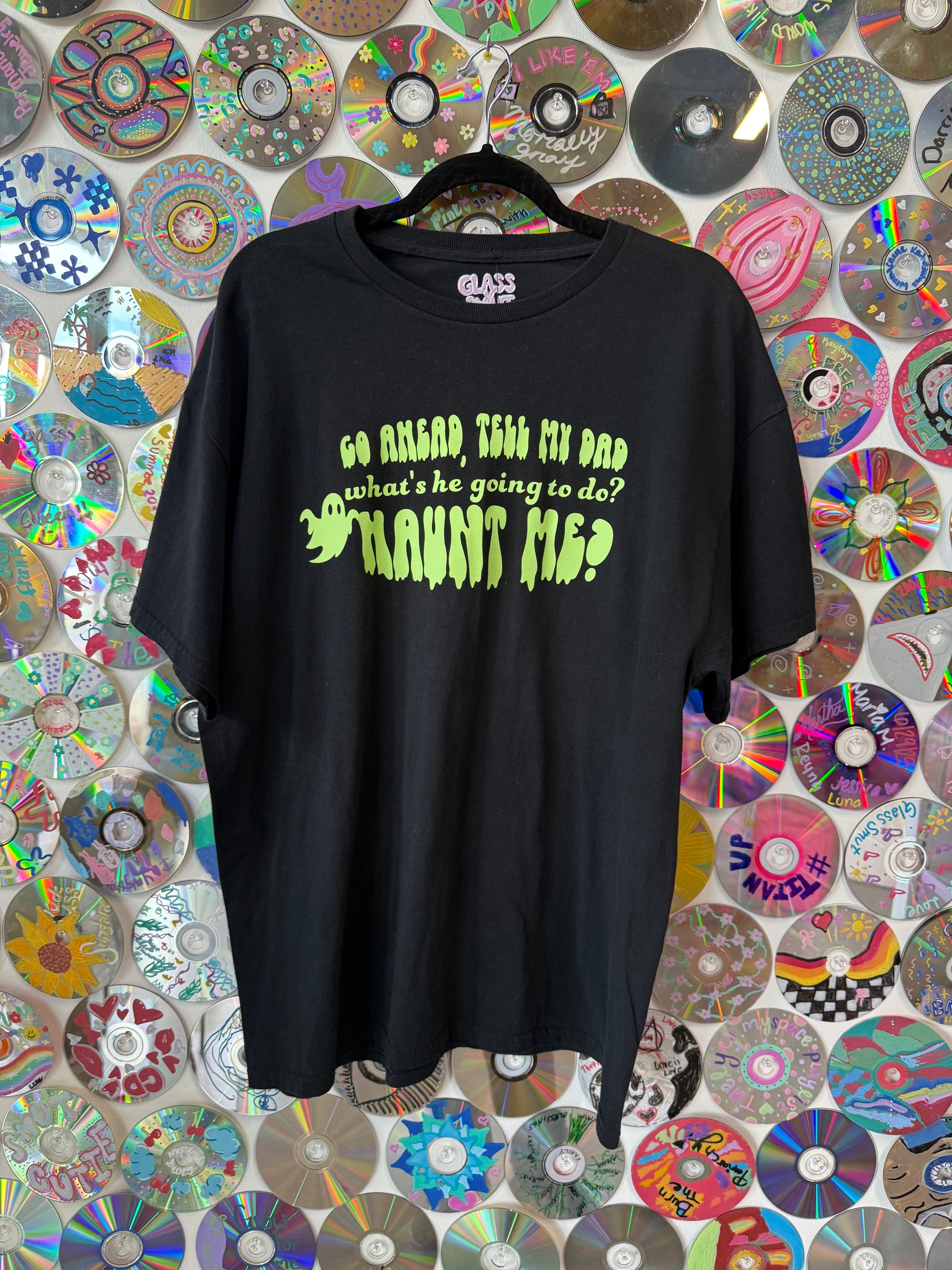 Black Crew neck t-shirt that reads "Go ahead and tell my dad, what's he going to do? Haunt me?" in a green drippy font on the front, sized XL