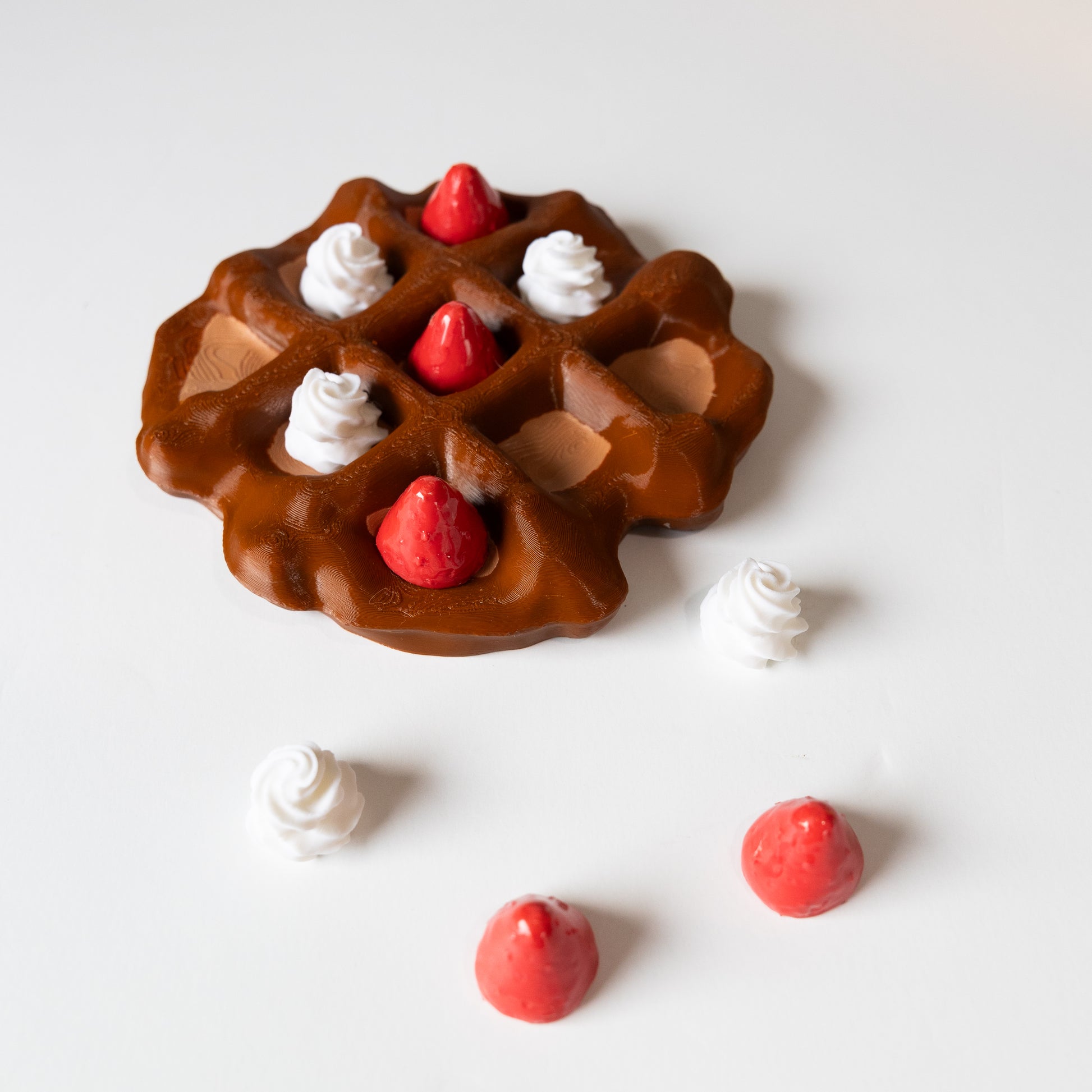 Sweeten up your game time with this adorable 3D-printed Belgian Waffle Tic Tac Toe set! The board is designed to look like a perfectly golden waffle, with crispy squares that hold your game pieces—strawberries and whipped cream.