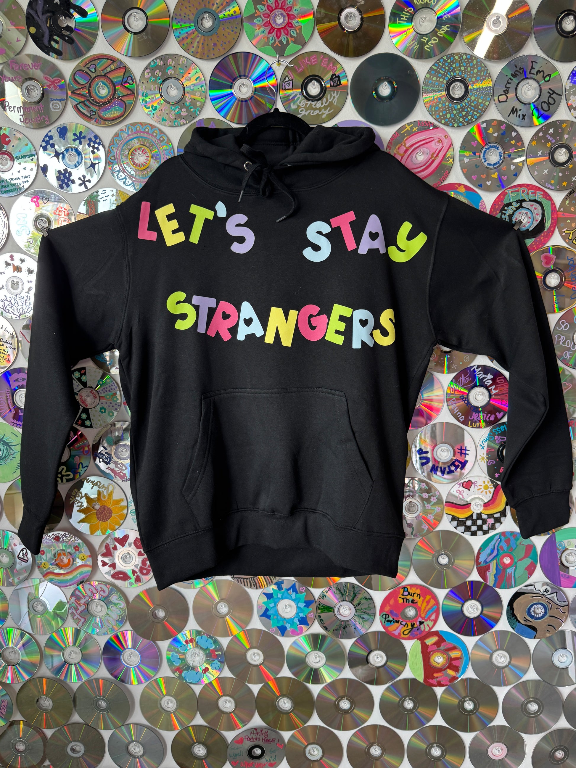 Black Standard hoodie featuring GlassSmut Original Design "Let's Stay Strangers" with the letters offset in a playful jumble or ransom note style on the chest.