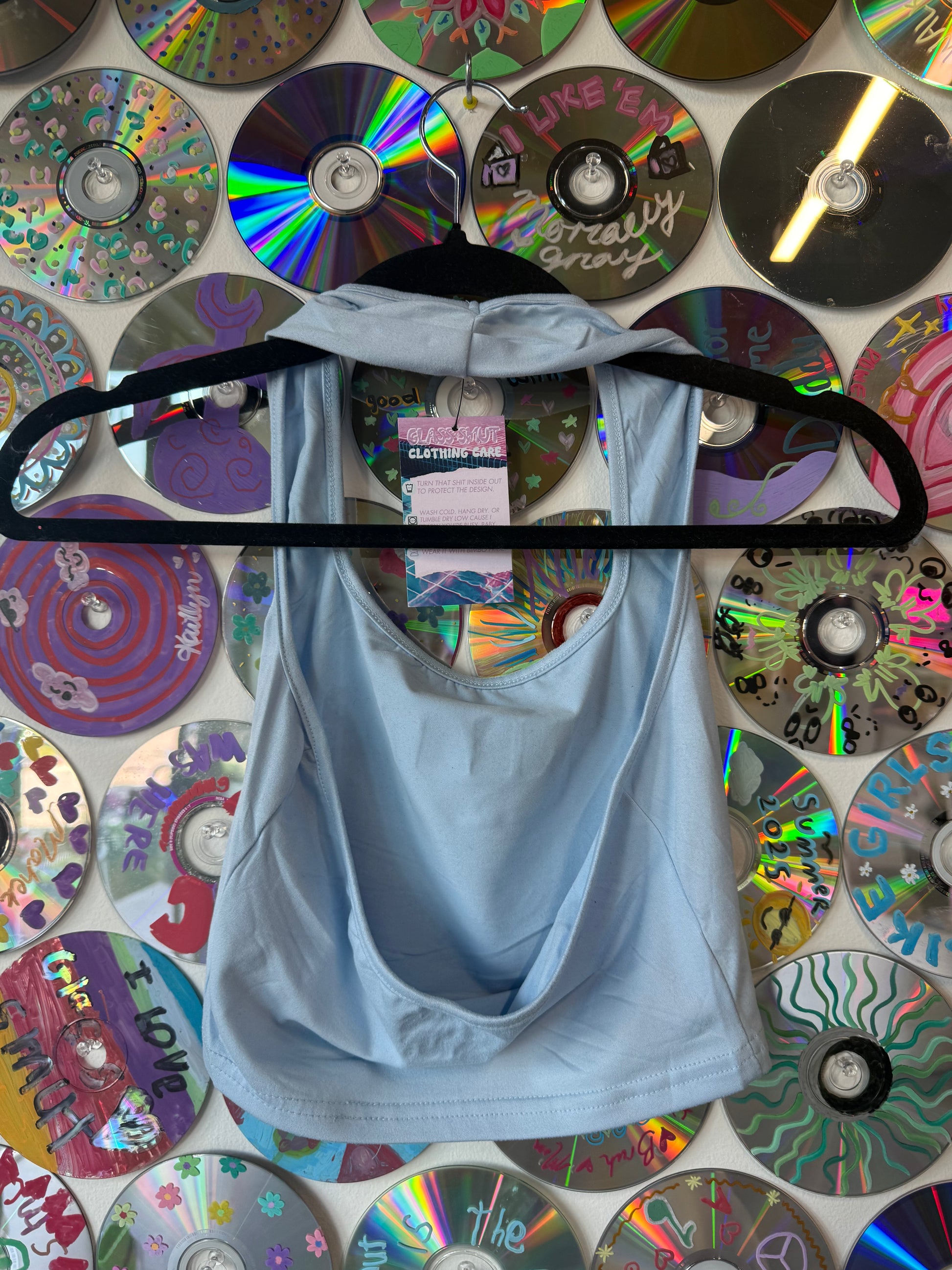 Baby Blue halter top that reads "MANEATER" in a black and white snakeskin across the chest, sized xs.