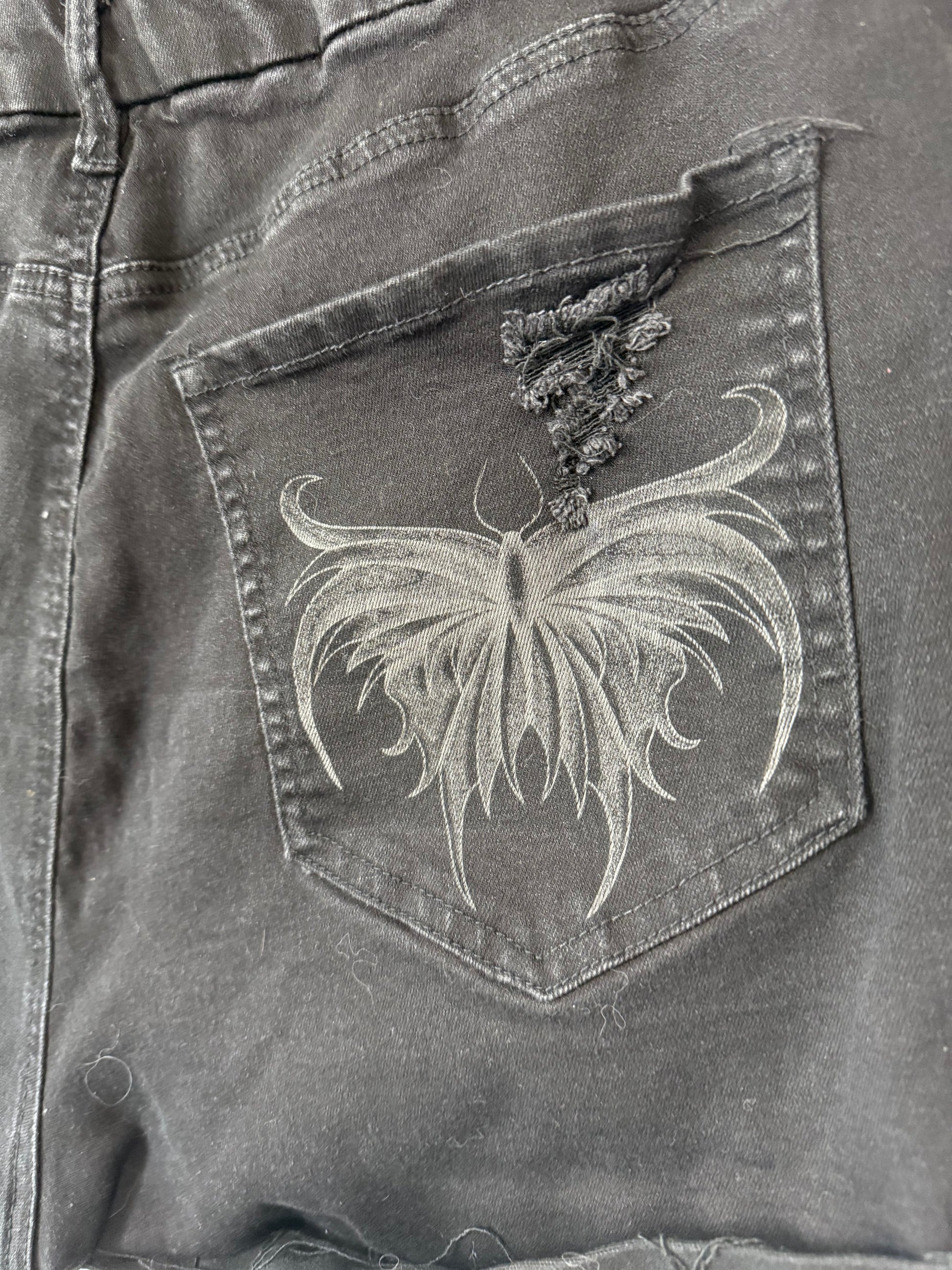 Black denim distressed shorts size 20/2XL with stars an moths laser engraved on the front and back.