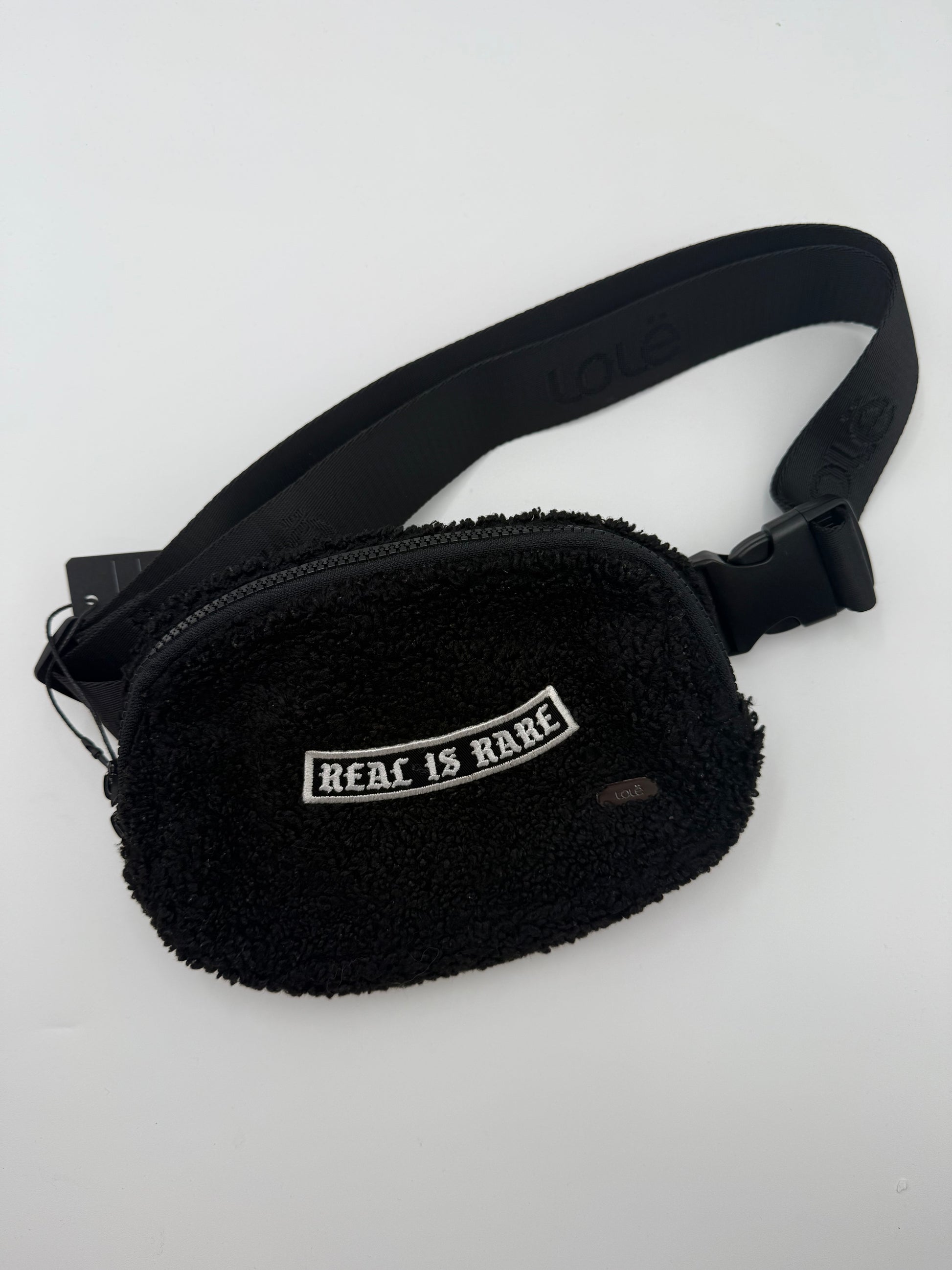 Black Sherpa belt bag that features a black and white patch that reads "Real is Rare”