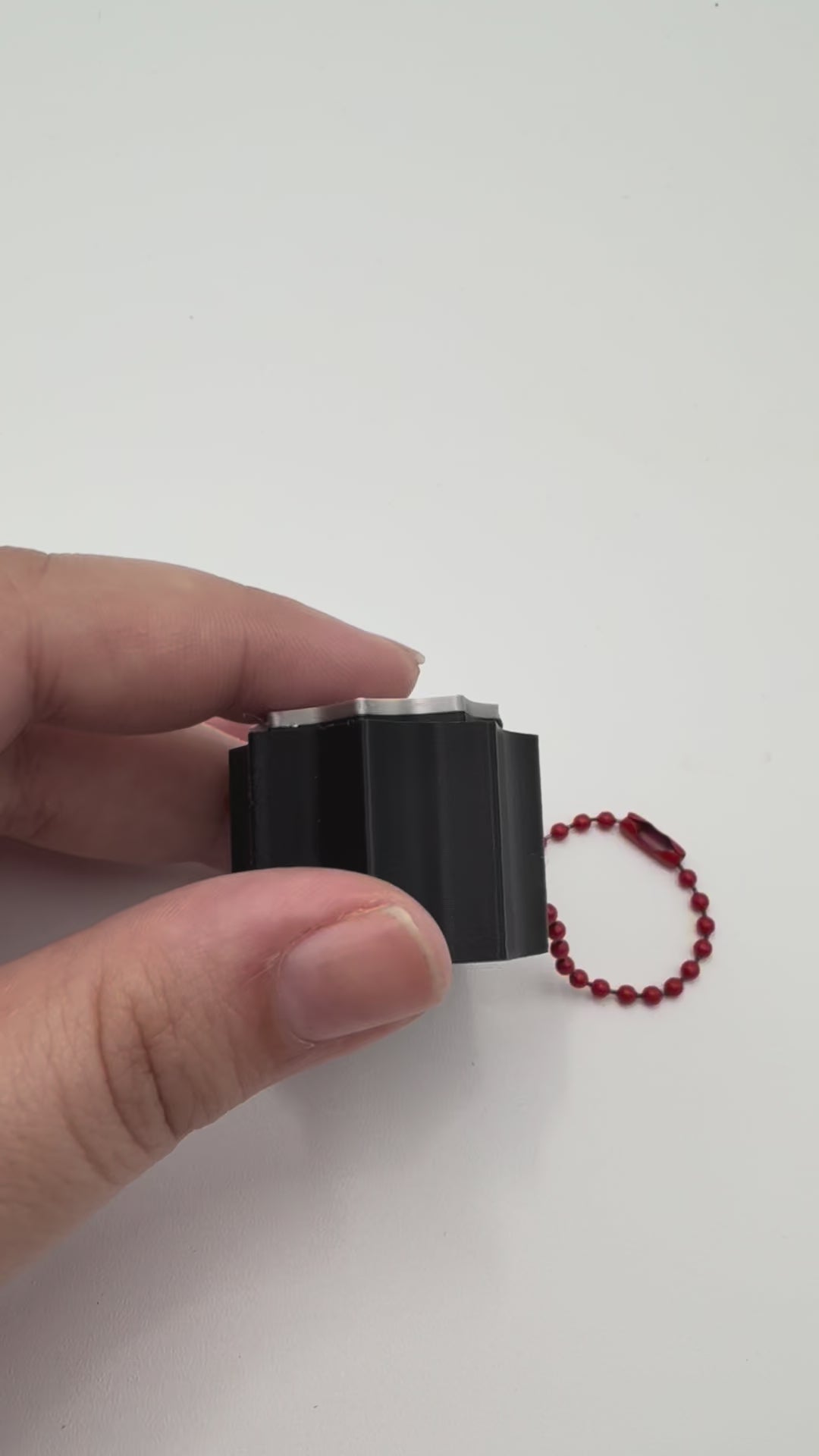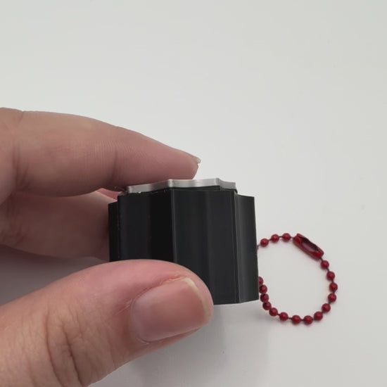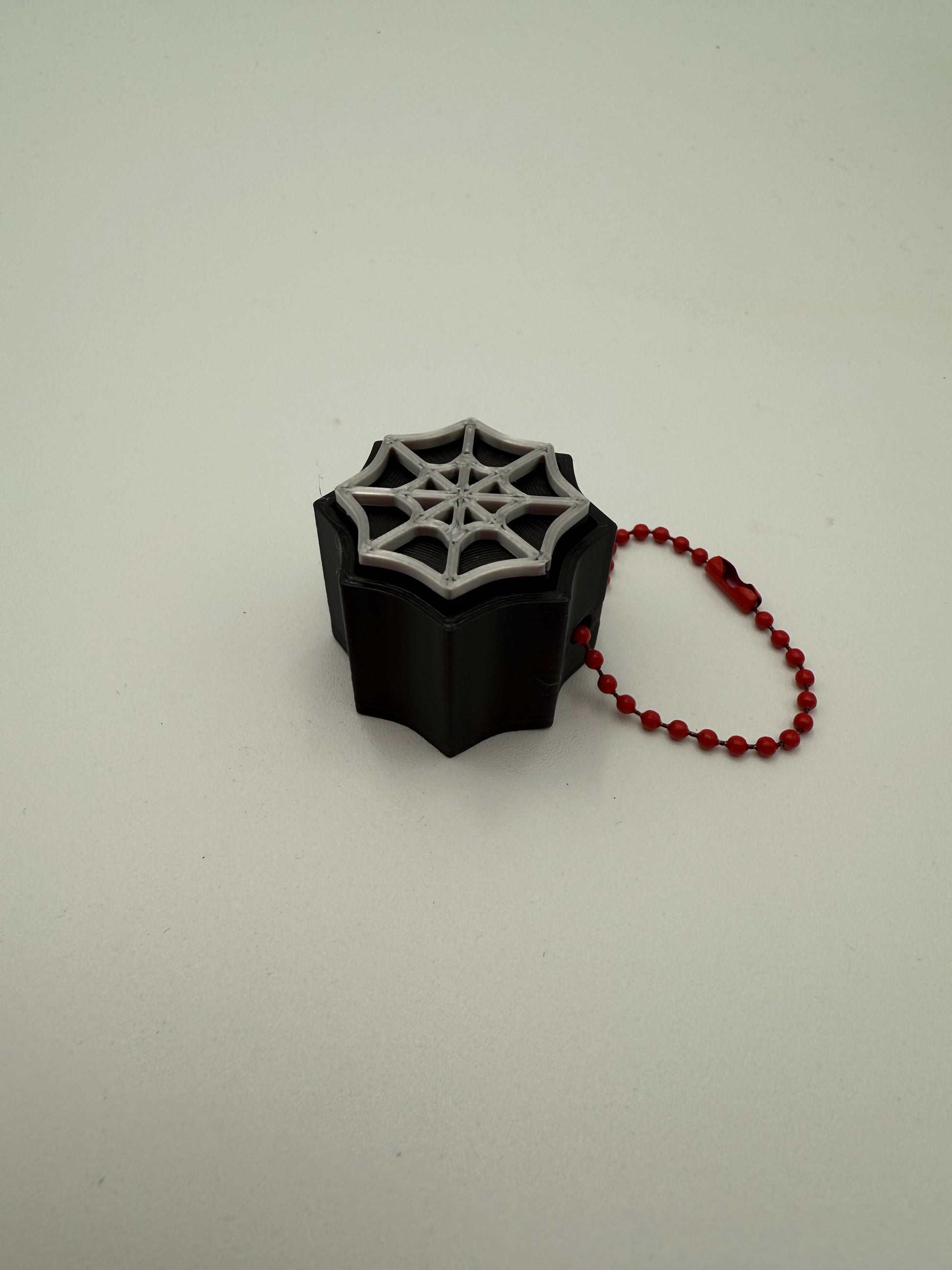 Black clicker keychain in the shape of a silver spider web and a random colored ball chain