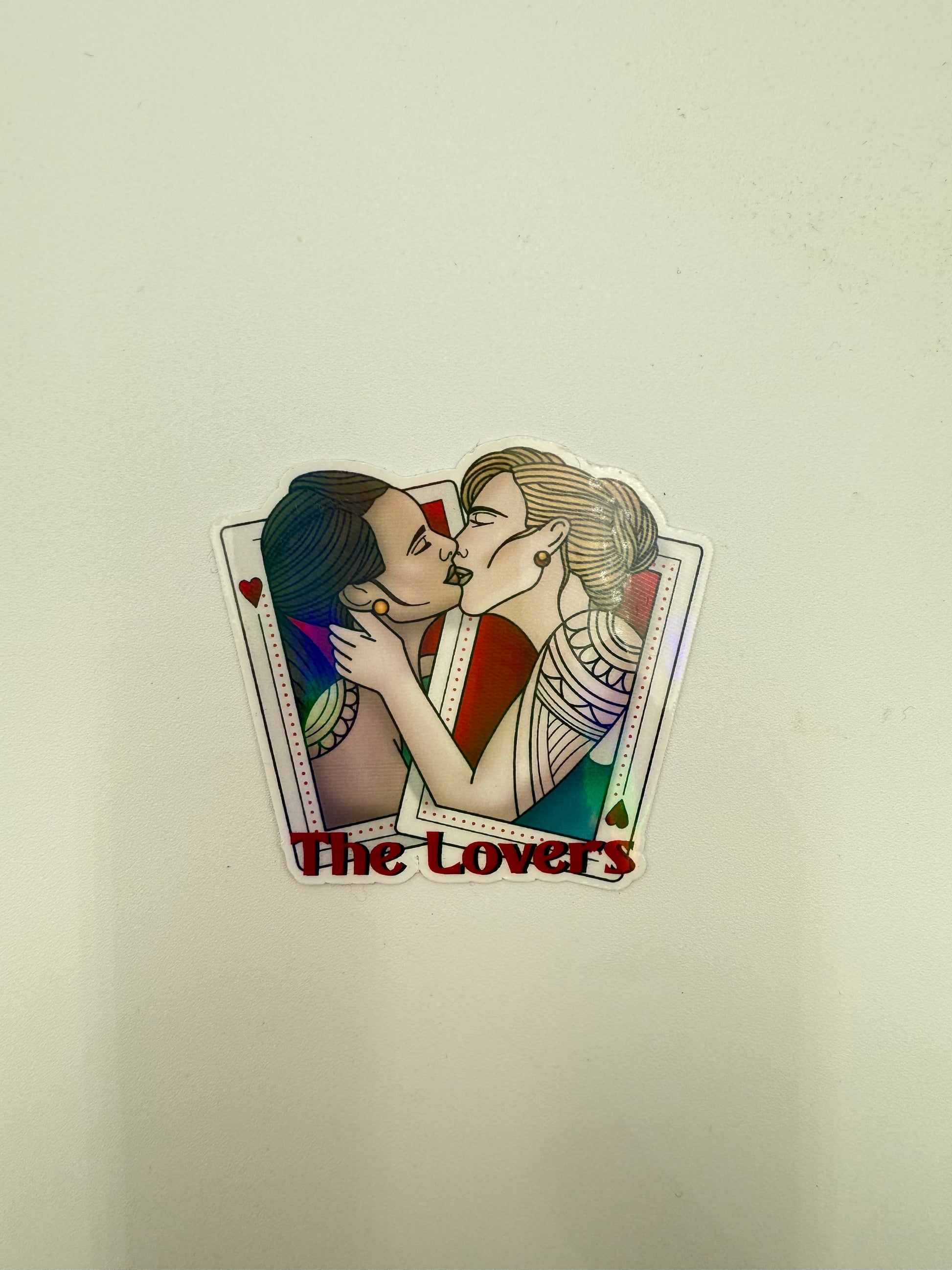 Two women popping out of their playing card frames kissing each other with the words "The Lovers" across the bottom