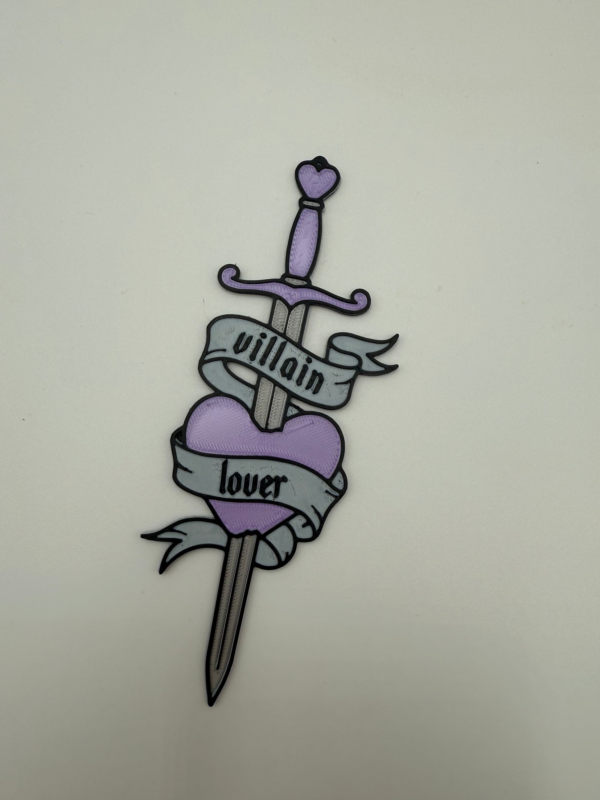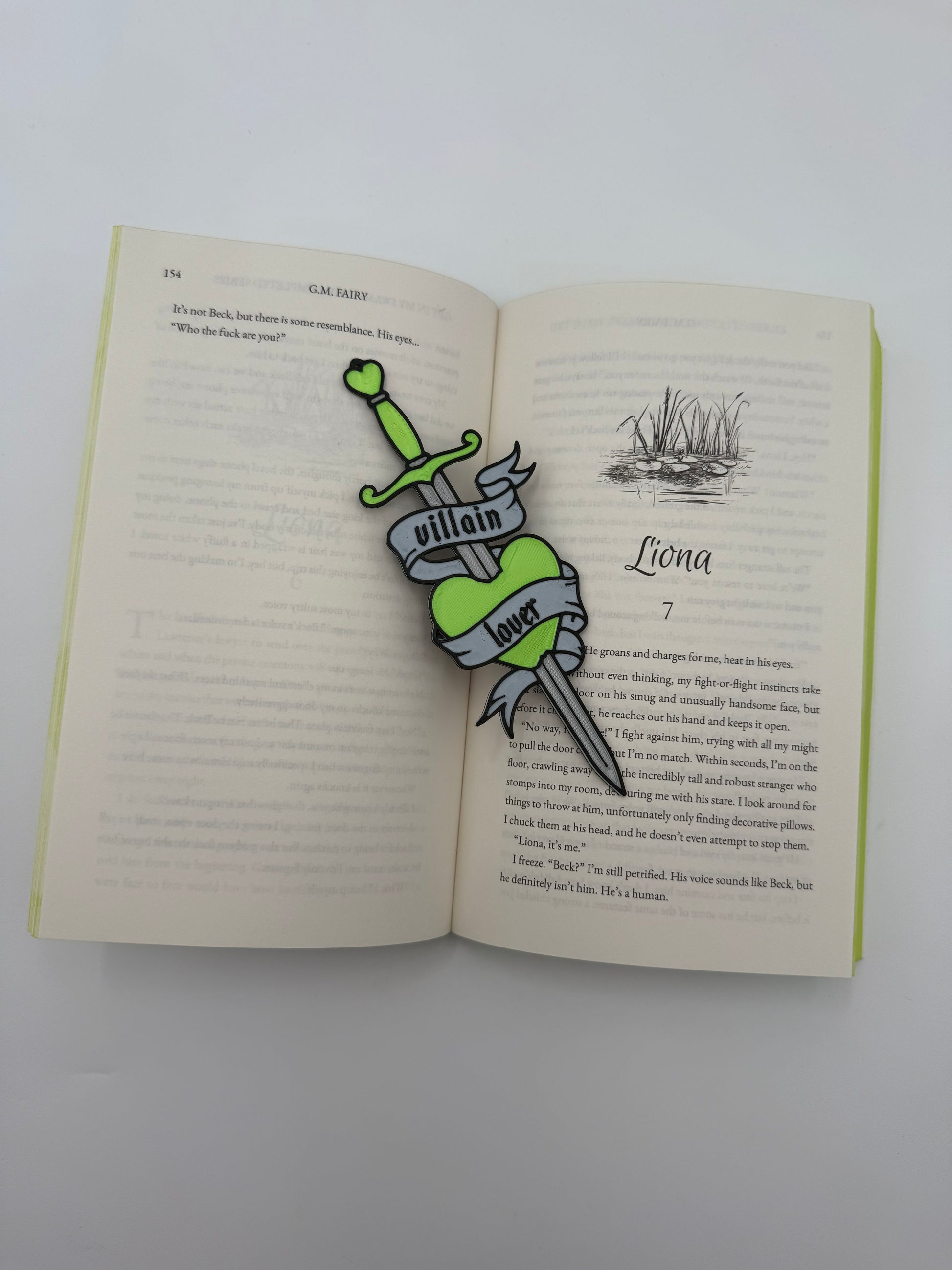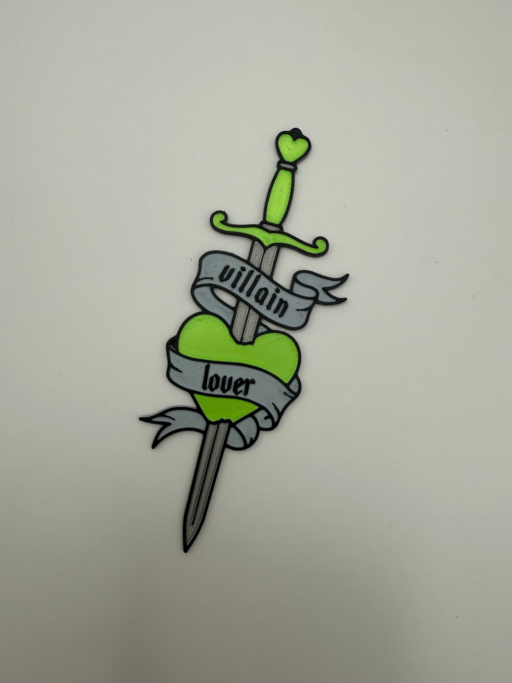 Sword Stabbing Through a Heart with a Ribbon that reads "Villain Lover" Ultralightweight 3D Printed Bookmark. Original GlassSmut Design