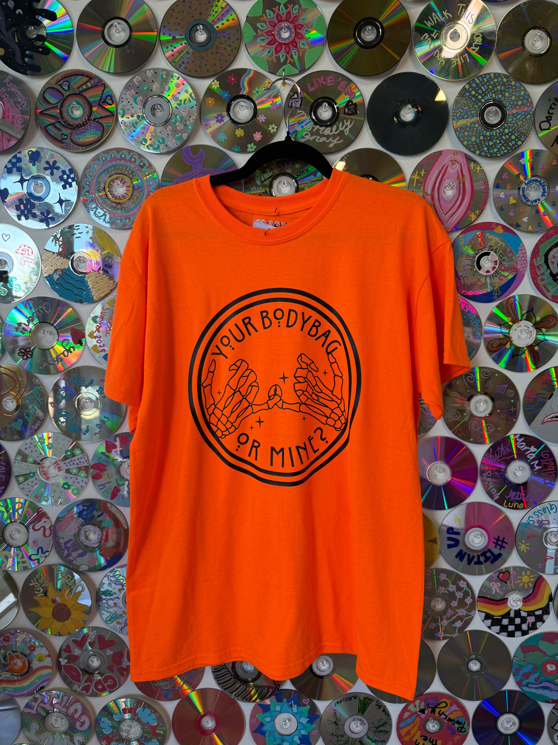 Bright orange t-shirt size large that reads "your body bag or mine?" within a circle with two skeleton hands pinky swearing each other.